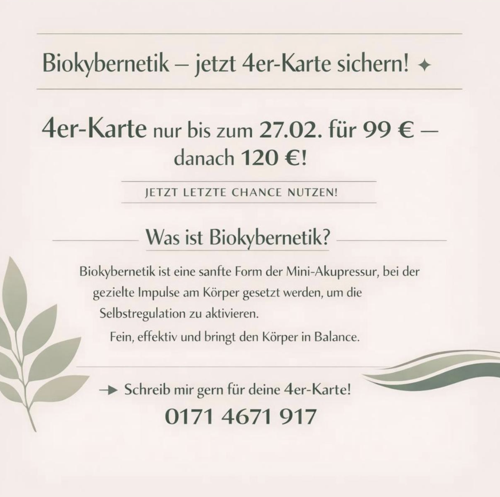 Mit meinem breiten Spektrum an Fähigkeiten und Erfahrungen möchte ich dich inspirieren und unterstützen, deinen eigenen Weg zu einem erfüllten Leben zu finden. Ich freue mich darauf, dich auf dieser spannenden Reise zu begleiten und gemeinsam an deinen Zielen zu arbeiten.